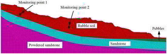 The numerical simulation model established using the finite element software FLAC3D 6.0 is shown in Figure 8. The model has a length of 490 m and a height of 150 m, with the landslide extending from west to east. It consists of a total of 33,006 block elements and 132,024 node points. The soil analysis employs the Mohr–Coulomb model. The boundary conditions include constraints on horizontal displacement on both sides of the slope and constraints on both horizontal and vertical displacement at the slope base. Two monitoring points are set up in the top and middle regions of the slope to monitor the displacement and pore water pressure changes of the accumulated mass. Based on the stratigraphy from the field exploration, four different soil types for the accumulated mass landslide are identified. The soil layer parameters obtained through field measurements and laboratory tests are shown in Table 3.