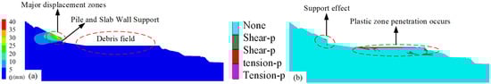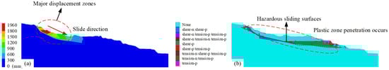 Displacement and plastic zone variations under natural working conditions: (a) x-displacement; (b) plastic zone.