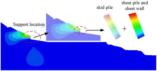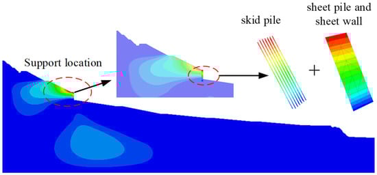 Based on the previous analysis, it has been confirmed that the accumulation body within the study area poses a potential risk of landslides under both natural and rainfall conditions. Therefore, it is particularly crucial to implement treatment measures for this accumulation body. In accordance with the previously proposed slope treatment plan, this paper adopts dual measures: slope cutting and load reduction, combined with sheet pile wall support, to reinforce the accumulation body and enhance its stability. The detailed layout and configuration of the support structure are depicted in Figure 10, which illustrates the implementation of the treatment measures.
