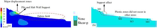 After the second round of treatment, the safety factor of the landslide accumulation body increased to 2.36. As shown in Figure 13, the second slope cutting did not significantly affect the displacement at the slope crest, with the maximum displacement at the crest remaining at 37.0 mm. At this stage, the landslide accumulation body is no longer at risk of sliding, and no plastic deformation occurs within it. The stability of the landslide after treatment is relatively good.