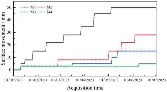After completing the remediation work on the slope of the landslide accumulation body, to ensure the effectiveness of the remediation and the long-term stability of the slope, a series of monitoring stations were established within the internal structure of the slope to continuously track and record dynamic changes in slope displacement. The relevant monitoring data are presented in Figure 14. By analyzing the monitoring data, it can be concluded that the slope of the accumulation body, after undergoing systematic remediation, has maintained good overall stability. During the six-month monitoring period, the M1 monitoring point recorded the largest cumulative displacement, reaching 50 mm. Meanwhile, the cumulative displacements at monitoring points M2 to M4 exhibited a decreasing trend, with M2 recording 28 mm, M3 recording 15 mm, and M4 recording only 5 mm. Regarding the relatively large displacement at the M1 monitoring point, combined with its geographical location, it was analyzed that there was still some accumulation material near the slope crest area nearby that had not been thoroughly treated, which directly resulted in the cumulative displacement of 50 mm at M1. However, the area where the M1 monitoring point is located still maintains a stable state. The cumulative displacement data from monitoring points M1 to M4 further validate the effectiveness of the remediation measures, indicating that the remediated slope of the accumulation body is in a stable operational stage.