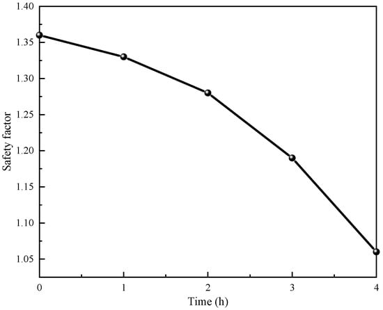Figure 16 visually depicts the dynamic process of how the safety factor of the landslide accumulation body changes over time under rainfall conditions. In the initial state, the safety factor of the landslide accumulation body is 1.36, a value generally considered to be within an acceptable safety range, indicating that the slope is relatively stable under static conditions. However, with the commencement of rainfall, the safety factor of the landslide body undergoes rapid changes. One hour after the rainfall begins, the safety factor drops to 1.34, indicating that the rainfall has already started to adversely affect the stability of the slope. Continuous rainfall further exacerbates this trend, with the rate of decrease in the safety factor gradually accelerating. When the rainfall duration reaches four hours, the safety factor of the landslide accumulation body has significantly decreased to 1.06, a value that is already below the safety factor threshold commonly used in practical engineering.