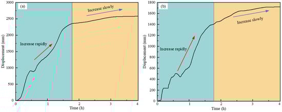 Displacement monitoring data indicate that the monitoring points at the slope crest underwent two stages sequentially: rapid displacement accumulation followed by gradual growth as the duration of rainfall increased. As shown in Figure 17a, when the rainfall lasted for 1.8 h, the horizontal displacement of the monitoring point at the slope crest reached 2356 mm; and when the rainfall duration reached 4 h, the maximum displacement at this location had increased to 2581 mm. Figure 17b illustrates the displacement changes of the monitoring point located at the middle of the slope, which also experienced two stages: a rapid displacement growth stage followed by a slow displacement growth stage as the duration of rainfall extended. After 1.8 h of rainfall, the displacement of the middle monitoring point reached 1400 mm, and after 4 h of rainfall, its displacement had increased to 1721 mm. The displacement monitoring results suggest that the stability of the middle region of the slope is higher compared to the slope crest region. Since the volume of the accumulation body at the slope crest is significantly larger than that in the middle region, rainfall increases the mass load of the slope crest accumulation body, thereby intensifying the potential risk of landslides.