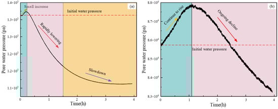 The changes in pore water pressure at the top of the accumulation body and in the middle of the slope during rainfall are shown in Figure 18. As illustrated in Figure 18a, during the initial stage of rainfall, there is a brief increase in pore water pressure at the monitoring point at the top of the accumulation body. As the duration of rainfall increases, the pore pressure at this monitoring point rapidly decreases to 1.16 × 105 Pa after the rainfall ends. The increase in water content of the rock and soil mass during rainfall leads to an increase in pore water pressure. However, during the occurrence of a landslide, due to the displacement and deformation of the rock and soil mass, the water in the pores is released or flows out, resulting in a decrease in pore water pressure. This is consistent with the displacement monitoring results at the top of the accumulation body, where sliding is prone to occur, causing a rapid decrease in pore water pressure at the top monitoring point.
