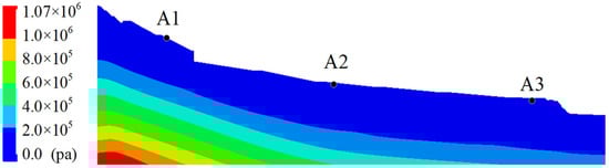 To more accurately assess the impact of rainfall on the stability of the slope at the 1-1′ profile, a simulation experiment under rainfall conditions was conducted in this study. The experiment simulated the slope’s response to rainfall by precisely controlling the duration of the rainfall. During the experiment, key parameters such as the safety factor of the slope, displacement changes, and pore water pressure variations within the slope were monitored to obtain critical data for evaluating the stability of the landslide. The initial pore water pressure is depicted in Figure 15.