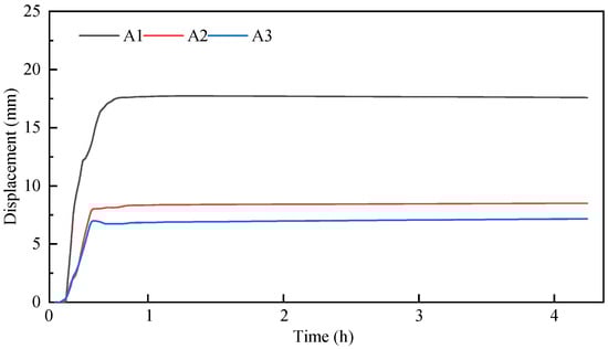 Displacement monitoring data show that the monitoring points at the slope crest underwent two stages: rapid displacement accumulation and stability, as rainfall duration increased. As shown in Figure 20, when the rainfall lasted for 0.5 h, the horizontal displacement of the monitoring point at the slope crest reached 17.6 mm. Subsequently, as the rainfall continued, the displacement of monitoring point A1 remained unchanged and was in a stable state. A2 and A3 represent the displacement changes of monitoring points at the middle and rear edges of the slope, respectively. They underwent two stages of rapid displacement growth and stability as the rainfall duration extended. After 0.5 h of rainfall, the displacement of the middle monitoring point reached 8.0 mm, and the displacement of the rear edge monitoring point was 6.9 mm. After 4 h of rainfall, their displacements did not increase. The displacement monitoring results indicate that the stability of the middle and rear edge regions of the slope is higher compared to the slope crest region. However, the treated accumulation body slope can still maintain a stable state under rainfall conditions.