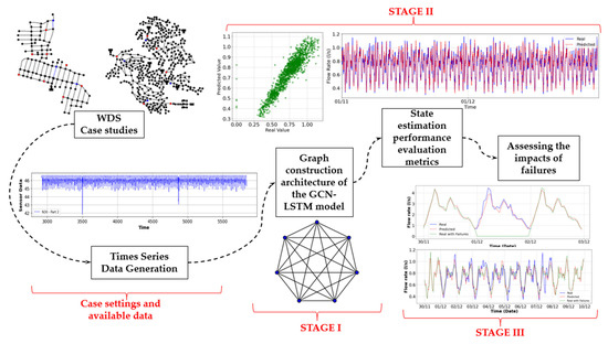 This section describes the proposed GCN-LSTM model for SE and is divided into three parts. First, the architecture of the GCN-LSTM model for SE is described (Section 2.1). Second, relevant aspects of the experimental design and performance evaluation metrics are explained (Section 2.2). Third, the impact of failures on real-time monitoring systems is assessed (Section 2.3). Figure 1 presents the main stages of the proposed methodology.