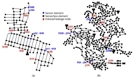 In the C-Town Network, four pressure sensors in nodes (J58, J96, J238, J314) and two flow sensors in pipes (P63, P220) were adopted as existing in the network and were randomly located. No scenario with variation in the demand pattern was included in this network since it has five consumption patterns with a one-year duration. Only the scenario associated with leak events at some randomly chosen nodes, different from the sensors, was included, with leak periods ranging from 4 to 5 h in duration. The nodes selected for leak inclusion in each network, the duration times, and the leak area size in square meters (m2) are shown in Table 1, and Figure 2 shows each network’s general layout, sensor locations, and leakage nodes.