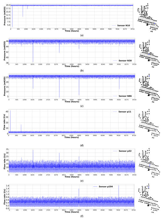 Time series in the District-B Network; sensors (a) N-10, (b) N-30, (c) N-86, (d) p11, (e) p32, and (f) p104.