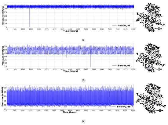 With the results of the time series of each sensor, it is possible to visualize the problems posed by the monitoring of WDNs; for example, the sensitivity of the sensors to anomalous phenomena, such as leaks, is variable in each network. Having a low density of sensors and limitations in data availability generally make it difficult to detect these events, which can result in areas that need to be monitored and could present operational problems. The management of WDNs should consider using advanced learning and analysis models that use data obtained with few resources and can estimate hydraulic behavior accurately, even under adverse operating conditions.