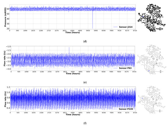 Figure 4 illustrates the time series generated in case study 2, the C-Town Network. Given the larger scale of this network, it was observed that specific pressure sensors, such as J238, appeared to show little to no impact in their measurements in response to network leak events (Figure 4c). Similarly, among the flow sensors, P220 seemed to exhibit no significant alterations in its readings (Figure 4f), indicating that some sensors have limited or no sensitivity to the induced anomalous events.