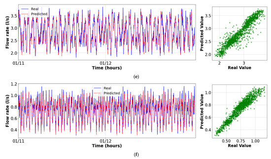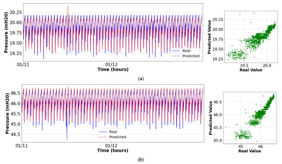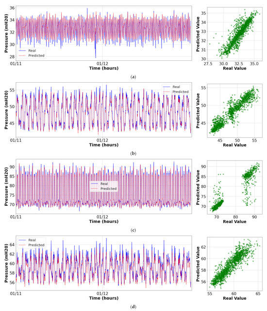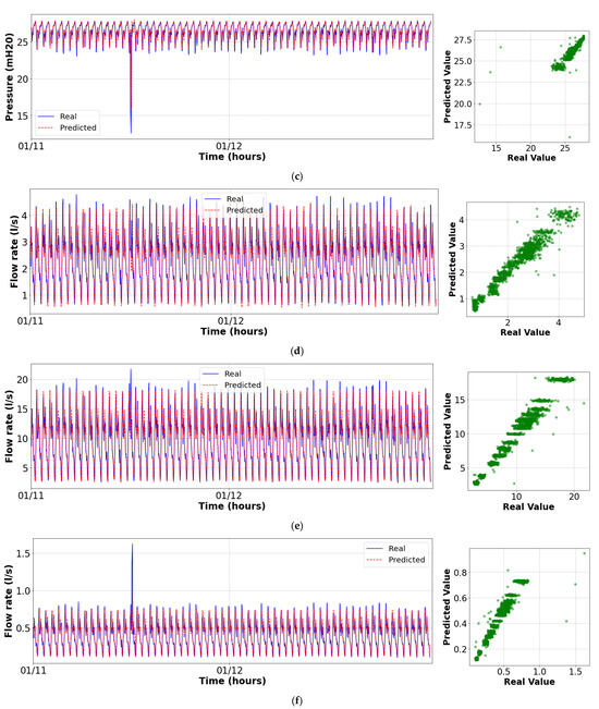 In the C-Town network, the sensors did not show the ability to predict or detect leakage events; the predictions displayed an unaltered pattern during the analyzed period. This may be attributed to the network’s larger scale compared to the previous network and the greater distance and dispersion of sensors. Overall, all sensors showed an acceptable level of accuracy in SE prediction. The SE analysis is presented for each sensor analyzed in Figure 6; the real values are represented by the blue lines and the predicted values by the red dotted lines. The scatter plots visualize the predicted values closely aligned with the measured values.