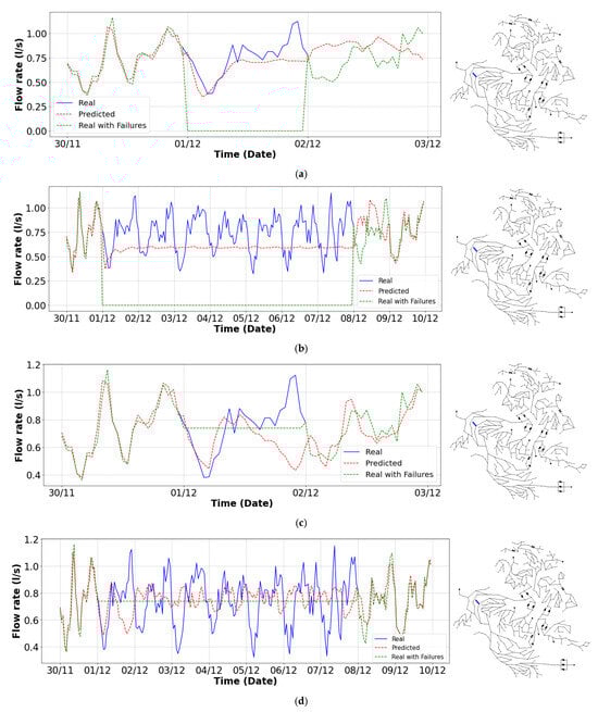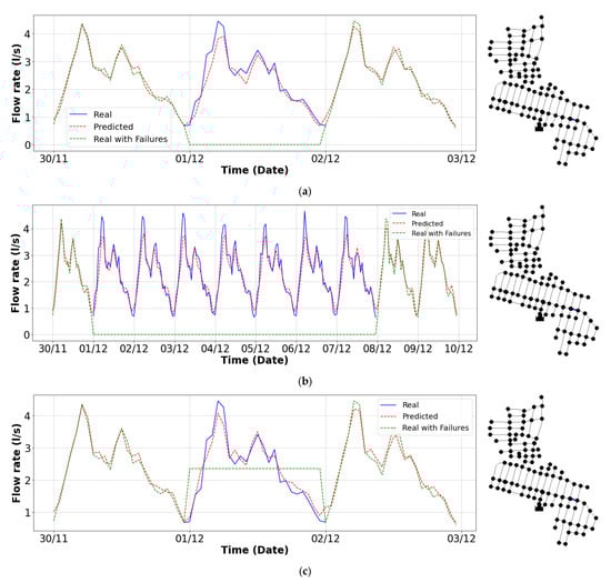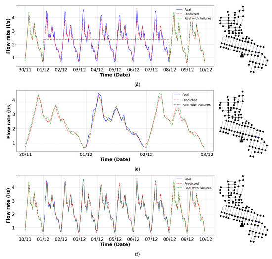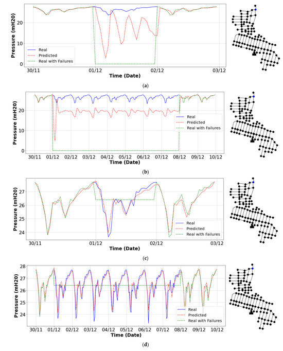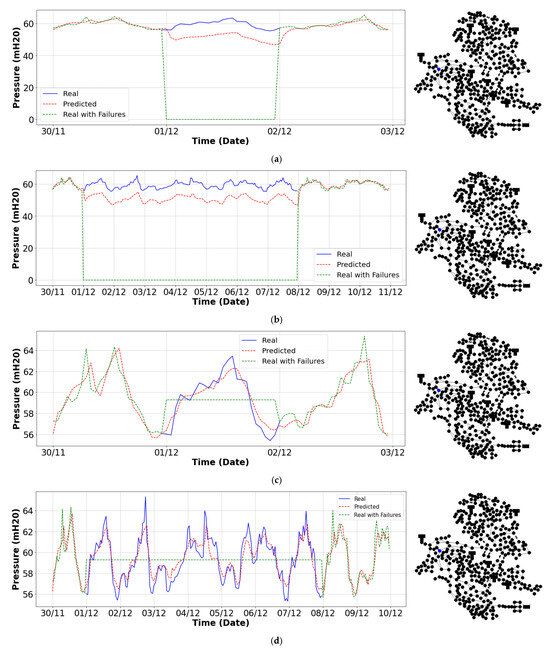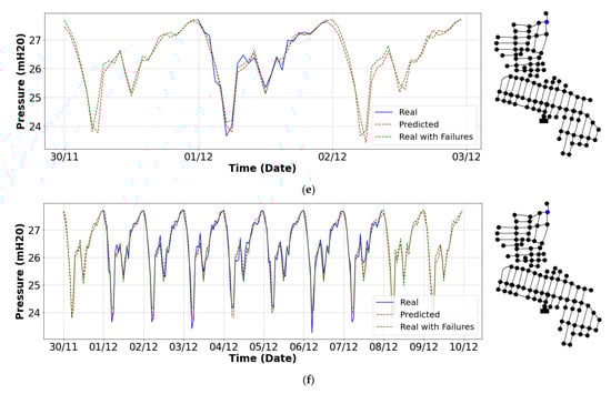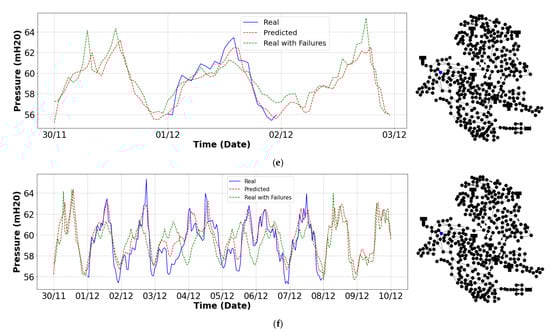 The results of the performance of the GCN-LSTM model in evaluating the impact of failure in the N86 sensor of the District-B network are shown in Figure 7, where the prediction in the different events analyzed is observed. Three other lines are shown superimposed: the blue lines show the actual values generated in the sensor time series (without failures); the dotted green line shows the actual values with the missing data replaced, as explained in Section 2.3; and the red line shows the prediction values obtained with the GCN-LSTM model. The right side of each figure shows a small version of the network, and the location of each sensor is highlighted as a blue dot.