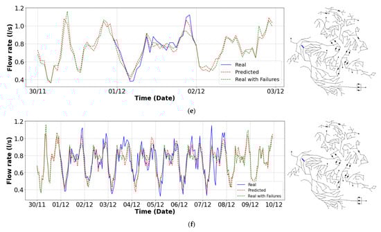 When analyzing a flow sensor in the District-B network, in this case, sensor p11, better results were obtained in all the events analyzed, as shown in Figure 8. The better performance reflected by the model proposed in this sensor was likely related to the flow magnitudes recorded in this pipe since it had a low range of monitored flow. In this analysis, the six failure events were not a constraint to being able to perform SE on the network. When calculating the evaluation metrics in this sensor, the results show that all the obtained values of and were less than 0.33 and all the values were greater than 0.88. The results of the evaluation metrics for all failure events analyzed in sensor p11 are also shown in Table 3.