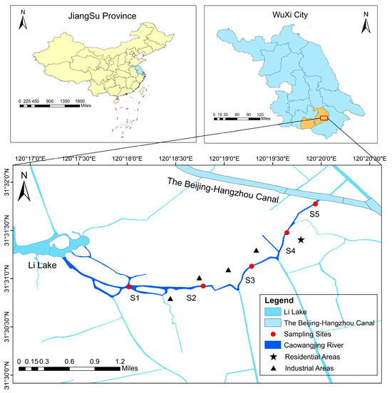 The Caowangjing River originates from the Beijing–Hangzhou Grand Canal in the east and merges with Wuli Lake in the west, serving a crucial function in linking the lateral water system between the Grand Canal and Taihu Lake. In Liangxi District, this river has a total length of around 3.7 km and a width ranging from 20 to 30 m. Numerous tributaries exist along the northern and southern banks of Caowangjing. Due to the unstable water quality of its tributaries, the Caowangjing River is vulnerable to the effects of the surrounding water system. In addition, sluice construction has resulted in weak hydrodynamic conditions, limiting this water body’s ability to dilute, degrade, and transform pollutants. As an urban river, the Caowangjing River flows through industrial parks, residential districts, and farmland, with each stretch being subject to various degrees of human impacts and pressure.