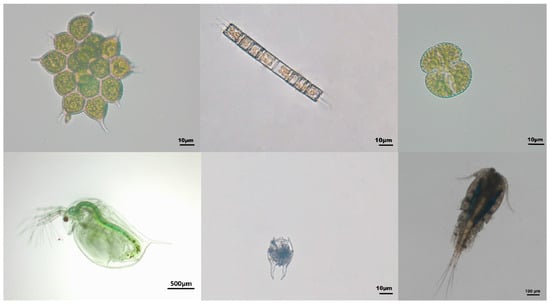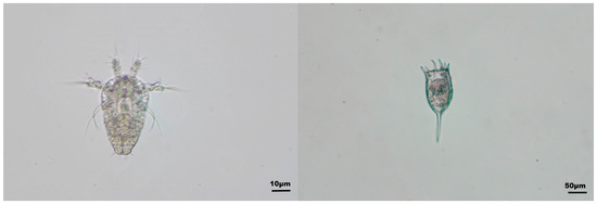 Water samples were collected from the upper, middle, and lower layers using a 5 L water sampler and mixed well at the sampling site. Then, each well-mixed water sample was filtered through a 300-mesh filter (pore size: 48 μm), and a total of 5 L of well-mixed river water was filtered. The filtrate was then brought to a final volume of 50 mL by adding 2 mL of formaldehyde and then mixed. Before identification, the samples were mixed well again, and 5 mL was taken each time and added to the zooplankton-counting chamber. Identification and counting were performed under a microscope (Olympus Corporation, Tokyo, Japan) at 40× magnification, wherein the counting field was able to cover the entire zooplankton-counting chamber. Each sample was counted three times, and the final result was the average of these counts. Species were identified based on references [27,28,29]. Microscope images of Daphnia magna, Brachionus farficula, and Mesocyclops leuckarti species are shown in Figure 2.