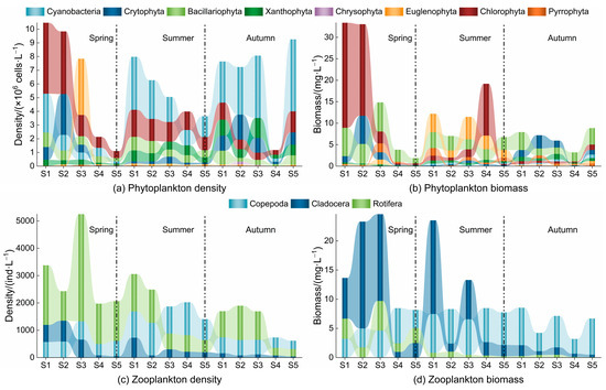 For zooplankton, the densities varied from 617.4 to 5248.88 ind·L−1, with an average of 2171.91 ind·L−1. Significant seasonal differences (p < 0.05) in density were observed, with a peak in the spring (78.16 ind·L−1) and a trough in autumn (29.80 ind·L−1) (Figure 6). Rotifera dominated the zooplankton community in the spring and autumn, accounting for 67.07% and 57.27% of the total, respectively. However, Copepoda prevailed in the summer, comprising 47.25% of the total. The spatial density pattern corresponded to the following order: S3 > S1 > S2 > S4 > S5; it was primarily influenced by Rotifera, followed by Copepoda. The highest recorded density of Rotifera was 62.85% at S3. Zooplankton biomass ranged from 3.19 to 24.58 mL·L−1, averaging 11.59 mL·L−1. The difference in biomass between seasons was also significant (p < 0.05), and the trend aligned with the density. Cladocera dominated the spring zooplankton community, accounting for 55.78%. Copepoda dominated in the summer and autumn, accounting for 49.07% and 79.54%, respectively. The spatial biomass pattern corresponded to an order of S1 > S3 > S2 > S5 > S4, with Rotifera predominating at sites S1, S2, and S3, while Copepoda was prevalent at sites S4 and S5.