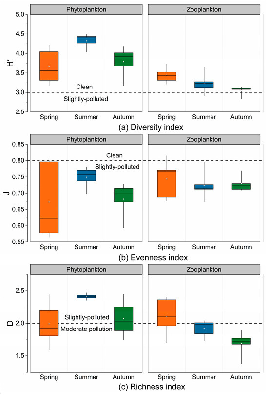 The dominance value (Y), the Shannon–Wiener diversity index (H′), Pielou’s evenness index (J), and the Margalef richness index (D) were used to characterize plankton community structure and evaluate river status. The calculation formula is as follows: