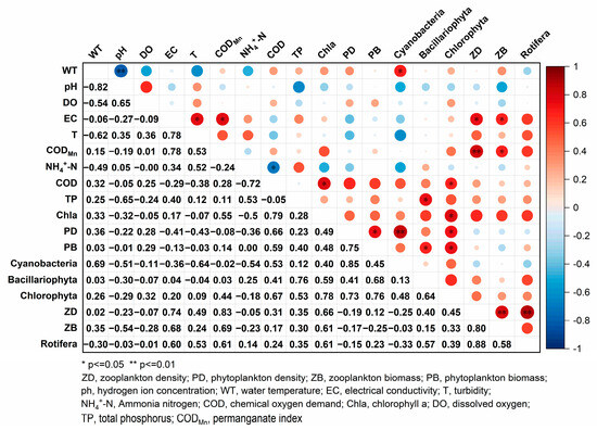 The Pearson correlation analysis results show (Figure 9) that the density of Chlorophyta is significantly positively correlated with COD (p < 0.05). Both zooplankton density and biomass had a significant positive correlation with EC and CODMn (p < 0.05). The results of the correlation analysis between phytoplankton and environmental factors varied among different phyla, with the density of Chlorophyta exhibiting a significant positive correlation with Chla (p < 0.05). The density of Cyanobacteria exhibited a significant positive correlation with WT (p < 0.05), indicating that an elevated WT facilitated the proliferation of Cyanobacteria. The density of Bacillariophyta exhibited a significant positive correlation with TP (p < 0.05), suggesting that phosphorus substantially influences Bacillariophyta.