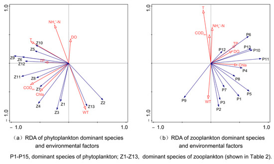 (2) The phytoplankton community distribution in autumn was less similar to that in the spring and summer, and the primary environmental factors that affected the structure of the phytoplankton community were T, WT, and NH4+-N. There was a significant seasonal difference in the distribution of the zooplankton community, with WT, CODMn, and NH4+-N identified as the primary environmental factors influencing this distribution.