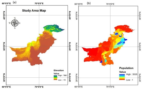 The study area map of Pakistan, along with (a) elevation and (b) population maps of the study area.
