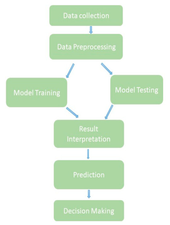 We collect data on crop yields, production, area, and other influencing factors. Next, we clean and prepare the data by addressing missing values, outliers, and normalization. We then train both a linear regression model and a random forest model using the preprocessed data to identify relationships between the variables. The model’s accuracy is evaluated on a validation dataset to assess its performance. After that, we analyze the model’s coefficients and predictions to understand the impact of various factors on crop yield, production, area, and both surface and groundwater. Finally, we use the trained model to predict future crop yields, production, area, and groundwater based on new input data as shown in Figure 2.