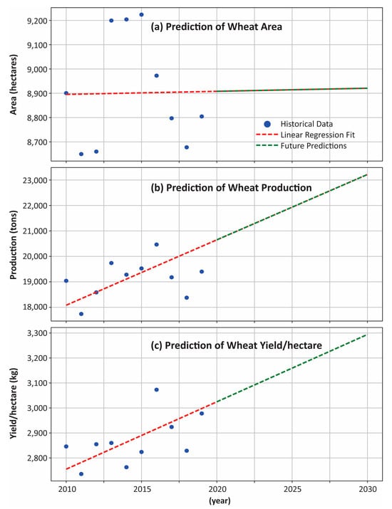 The (a) prediction of wheat area, (b) prediction of wheat production, and (c) prediction of wheat yield/hectare through linear regression using machine learning algorithm. The line represents the model prediction of wheat.