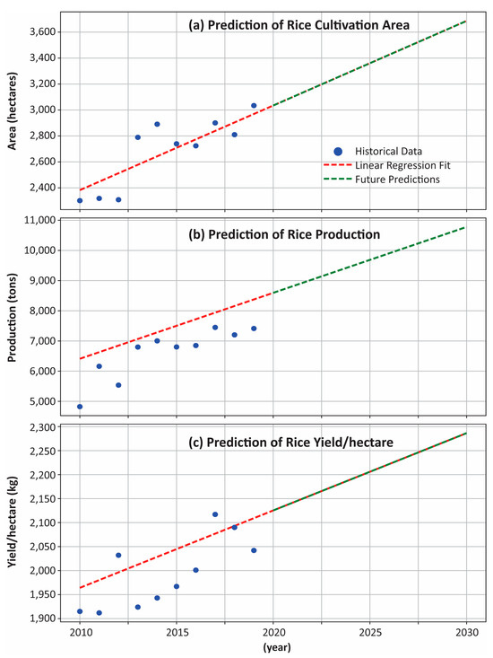 Same as Figure 3, but for the rice crop. (a) Prediction of rice area, (b) prediction of rice production, and (c) prediction of rice yield/hectare through linear regression using machine learning algorithm.