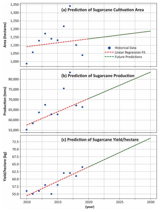 Same as Figure 3, but for the sugarcane crop. (a) Prediction of sugarcane area, (b) prediction of sugarcane production, and (c) prediction of sugarcane yield/hectare through linear regression using machine learning algorithm.
