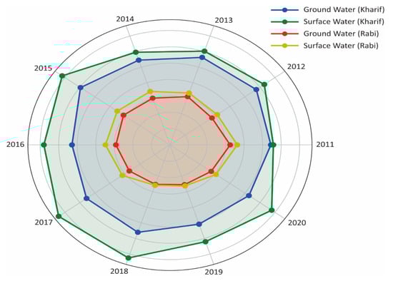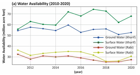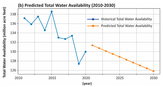 Figure 6 presents a radar chart that visually represents a ten-year dataset (2011–2020) of water availability during the Kharif and Rabi seasons. Our study thoroughly examined water availability patterns over a twenty-year period, specifically from 2010 to 2030, as shown in Figure 7 and Figure 8. We developed a predictive model using the random forest regression technique, drawing on historical data from 2010 to 2019. This method was selected for its robustness in handling non-linear data and its capacity to capture complex relationships among variables. The lines for groundwater and surface water illustrate both annual and seasonal fluctuations. Changes in resource allocation are indicated by converging or diverging lines, while the enclosed area reflects the total amount of available water. This chart serves as an effective tool for monitoring trends and patterns in water resources, aiding in the analysis of factors that influence agricultural water supply and supporting informed decisions regarding sustainable water management. Figure 7a and Figure 8 primarily focus on forecasting “Total Water Availability”, which includes both surface and groundwater sources. The historical data encompasses annual measurements for surface water, groundwater, and their combined totals.