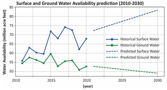 Ground and surface water availability predictions during 2010–2030 using random forest machine learning algorithm.