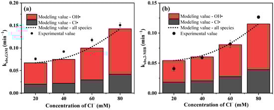 The rate constants of GSM and 2-MIB degradation in the UV-assisted electrochemical process at different electrolyte dosages are illustrated in Figure 2. As the chloride concentration increased from 20 mmol/L to 80 mmol/L, the experimental values of the rate constants for GSM and 2-MIB degradation increased from 0.0759 min−1 and 0.041 min−1 to 0.151 min−1 and 0.126 min−1, respectively. It can be concluded that the degradation rate of GSM and 2-MIB improved with the increasing electrolyte concentration. Additionally, the experimental and predicted values of the pseudo-first-order rate constants for GSM and 2-MIB degradation were in good agreement, which shows the applicability of the kinetics model. It was obvious that HO• and Cl• radicals played a crucial role in removing the GSM and 2-MIB, during which the HO• radical made a greater contribution to the degradation of GSM and 2-MIB than the Cl• radical. This result has been proven by previous work indicating that the contribution of HO• for the degradation of GSM and 2-MIB was more than 90% at a pH of 6 compared with those of reactive chlorine species such as Cl• [28]. As listed in Table S1 (Equations (6) and (8)), the presence of chloride ions has a quenching effect on the HO• and Cl• radicals generated in the UV-assisted electrochemical process. However, Figure 2 shows that the increase in the chloride ion concentration is conducive to the degradation of GSM and 2-MIB. This discrepancy can be explained because chloride ions can react with HO• and Cl• radicals to generate ClOH•− and Cl2•−, which will decay and finally transform back into HO• and Cl• [29,30,31]. Therefore, the presence of chloride ions in the electrolyte did not diminish but instead promoted the rate constants of GSM and 2-MIB degradation in the photo-electrochemical process.