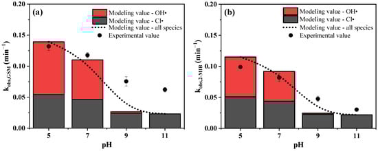 The solution pH that is directly associated with the existing forms of active species has been recognized as a vital factor in the UV-assisted photo-electrochemical process [32]. The contributions of HO• and Cl• radicals to the degradation of GSM and 2-MIB at different pH values in the photo-electrochemical process are shown in Figure 3. A similar tendency of the apparent rate constants was observed among the experimental and predicted values. With increases in the pH value from 5 to 11, the rate constants for the degradation of GSM and 2-MIB decreased from 0.132 min−1 and 0.099 min−1 to 0.0622 min−1 and 0.0302 min−1, thus decreasing by 52.9% and 69.5%, respectively. It has been reported that the formation of different radicals was significantly influenced by the solution pH. The concentrations of HO• and Cl• declined markedly when the pH increased from 7 to 10, especially for HO• [33]. Additionally, HO• has a lower oxidation potential at higher pH values [34]. It can be obtained from the modeling that the relative contributions of HO• to the degradation of GSM and 2-MIB were 61.08% and 55.8% at pH 5 but decreased to 0.11% and 0.09% at pH 11, respectively. The presence of Cl• played a more important role in GSM and 2-MIB degradation at pH 9 and 11 in the photo-electrochemical process. Liu et al. [35] also suggested that the degradation of sulfapyridine caused by HO• and Cl• showed significant differences at different pH values. When the pH increased from 4 to 10, the removal of sulfapyridine through HO• and Cl• was distinctly inhibited.