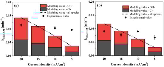Current density is of great importance for the generation of active species in the UV-assisted photo-electrochemical process [21,41]. The process of photo-electrochemical degradation for GSM and 2-MIB at different current densities is depicted in Figure 4. With the current density increasing from 5 mA/cm2 to 10 mA/cm2, the rate constants of GSM and 2-MIB degradation were increased from 0.0970 min−1 and 0.0668 min−1 to 0.1233 min−1 and 0.1106 min−1, respectively. An increasing current density will lead to an increase in the charge intensity on the two electrodes, which can cause the accumulation of active chlorine and further improve the yield of HO• and Cl• in the solution under UV radiation. As the current density increased to 15 mA/cm2 and 20 mA/cm2, the degradation rates of GSM and 2-MIB were not significantly promoted. This phenomenon could be mainly attributed to side reactions, such as oxygen gas evolution, which were promoted with the increase in current density [42,43]. A current efficiency decrease that can weaken the generation of active chlorine will follow. Additionally, the simulated rate constants and the respective contributions of HO• and Cl• to GSM and 2-MIB degradation in the kinetic model showed positive correlations with the current density in the range of 5–20 mA/cm2. The fitting results showed some differences from the experimental rate constants, which could be due to the simplification of the kinetic model by using the generation rate of active chlorine for GSM and 2-MIB degradation. To further optimize the fitted model, more factors should also be taken into consideration, such as polarization effects in the electrochemical process, the synergistic effects of UV radiation and chlorine production, and the equilibria between different free radicals. Wang et al. [44] also reported that the discrepancy between the predicted model values and experimental values of the rate constants for carbamazepine degradation by UV/chlorine resulted from the fact that the relative amount of HOCl and OCl− was regarded as the only aspect used in the predicted model.