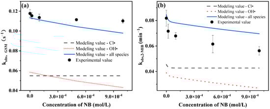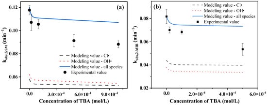 In real aquatic environments, many complicated pollutants (e.g., natural organic matter), regarded as free radical scavengers, are widely distributed in the water matrices [45,46]. It is necessary to evaluate the feasibility of the kinetic models of GSM and 2-MIB degradation in the presence of organic matter. As a commonly used HO• radical scavenger, NB can react with HO• at a second-order rate constant of 3.9 × 109 M−1 s−1, and its reactions with Cl• are negligible [39,47]. Considering that TBA could react with both HO• and Cl• actively with second-order rate constants of 6.0 × 108 M−1 s−1 and 3.0 × 108 M−1 s−1, respectively [48,49], it was applied to scavenge HO• and Cl• species. Therefore, TBA and NB are frequently used to distinguish the contributions of HO• and Cl• to pollutant degradation in advanced oxidation processes.