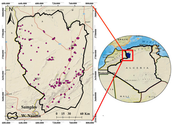 The Wilaya of Naama, located in northwestern Algeria, spans approximately 29,950 km2, making it one of the largest regions in the country [25]. The area is characterized by an arid climate and is geographically positioned within UTM Zone 30 N, with Easting coordinates ranging from 600,000 to 800,000 m and Northing coordinates from 3,550,000 to 3,800,000 m (Figure 1). Situated within the Saharan Atlas, Naama’s landscape features high plateaus and expansive steppe plains [43]. It is bordered by the Sahara Desert to the south and the Tell Atlas mountains to the north, with elevations reaching up to 2000 m above sea level [44]. Administratively, the Wilaya is divided into 12 municipalities, including major ones such as Naama, Mecheria, and Ain Sefra, with a total population of approximately 298,045, according to the 2018 census. Water resources in Naama are primarily derived from underground aquifers, notably the Continental Intercalary (Albian) and the Terminal Complex, which are vital for both agricultural and domestic purposes. The region also contains several ephemeral wadis that flow intermittently following seasonal rainfall.