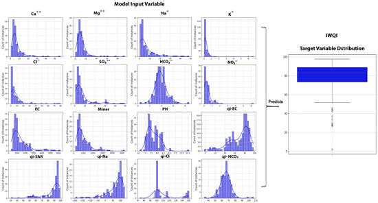 Figure 2 illustrates the distribution of the model input variables and the target variable, generated using Python 3.12 software. This study builds upon the work of Hussein et al. [25], who conducted the first detailed analysis of IWQI indices in the Naama region of Algeria. Hussein and colleagues quantified various water quality parameters with high precision, providing a robust foundation for evaluating water resource quality in the region.