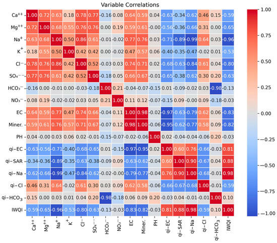 The IWQI is negatively correlated with key parameters, specifically Ca2+ (−0.591), (−0.652), (−0.961), and (−0.801) (Figure 3). These high negative correlation values indicate that as the concentrations of calcium, magnesium, sodium, and chloride ions increase, the IWQI decreases. This inverse relationship suggests that higher concentrations of these ions reflect poorer irrigation water quality, as indexed by the IWQ. The IWQI also exhibits strong negative correlations with qi-Na and electrical conductivity, with correlation values of −0.976 and −0.834, respectively. This indicates that increased sodium adsorption ratio and electrical conductivity are associated with a decline in IWQI, likely due to salinity or ion imbalances adversely affecting water quality. Conversely, the IWQI shows a high positive correlation with qi-SAR (0.885) and qi-Na (0.976), implying that higher values of these indices correspond to better irrigation water quality, as measured by IWQI. The correlation with qi-HCO3 is low and positive (0.099), suggesting a minor influence of bicarbonate concentration on the IWQI. These correlations underscore the importance of monitoring specific ions and indices for effective irrigation water quality management. The strong negative correlations with Ca2+, , Na+, and Cl− further suggest that controlling these ions could significantly improve the IWQI (Figure 3).