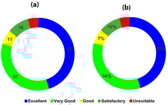 As shown in Figure 4, the dataset’s water quality distribution exhibits variability across five quality categories. A review of the data samples reveals that most samples fall into the “Excellent” or “Very Good” categories, with 75 samples classified as “Excellent” and 57 as “Very Good”, together accounting for 45.18% of the dataset. This distribution aligns with the correlation analysis findings, as many samples had ion concentrations below the critical limits, which are less likely to adversely affect water quality. In contrast, eleven samples (6.63%) were classified as “Good”, sixteen samples (96.64%) as ”Satisfactory”, and seven samples (4.22%) as “Unsuitable” (Figure 5). The relatively low percentage of samples in the lower quality categories supports the conclusions from the correlation analysis that samples with high concentrations of negatively correlated ions—such as calcium, magnesium, sodium, and chloride—are less frequent in the dataset.
