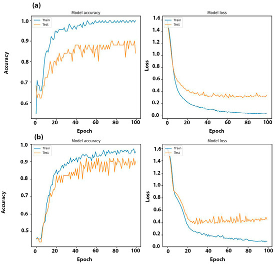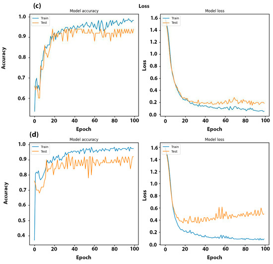 The optimizer used is Adam, one of the most popular optimization algorithms, which automatically adjusts the learning rate during training [64]. Adam is derived from AdaGrad and RMSProp and is well-suited to a variety of problems due to its ability to converge efficiently and stably [65]. For a multi-class classification problem, the ideal loss function is the sparse categorical cross-entropy, which calculates the difference between the predicted probabilities and the true class labels to formulate the optimization loss.