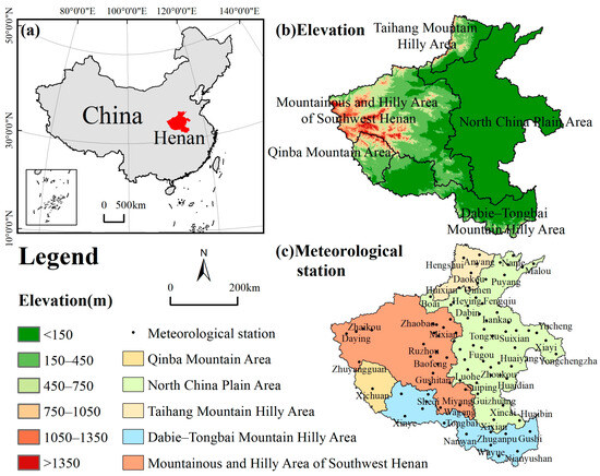 Henan is in the middle and lower sections of the Yellow River in central China, with geographical coordinates of 31°23′–36°22′ N and 110°21′–116°39′ E, and is located in the transition zone between the second and third stages of China. The elevation is higher in the western regions and lower in the eastern area, resulting in a ladder-like terrain distribution from west to east. Situated in the northern subtropical warm temperate zone, humid, and semi humid climate, Henan has obvious transitional climate characteristics and distinct four seasons, which belongs to monsoon climate. The average annual temperature varies between 12 °C and 16 °C, with extreme maximum and minimum temperatures recorded at 44.2 °C and −21.7 °C, respectively [43]. The annual rainfall is between 532.5 and 1380.6 mm, and the rainfall is predominantly concentrated in summer and autumn months, making up 60–70% of the annual rainfall [44]. In the mountainous and hilly areas of Henan, the Funiu Mountain, the east foot of Taihang Mountain, and the north side of Dabie Mountain are the centers of rainfall. When the rainstorm comes, the slope in hilly areas is steep and the water flow speed is accelerated, which easily causes sudden floods and serious soil erosion in mountainous and hilly areas.