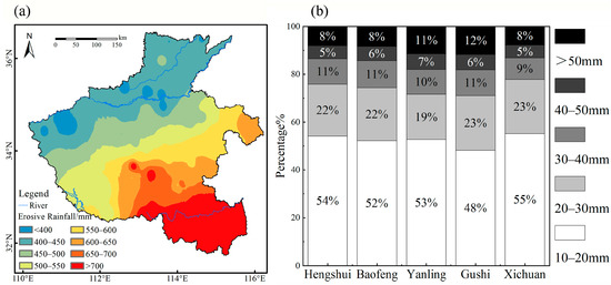 Spatial distribution of annual average erosive rainfall from 2000 to 2020 (a) and proportion of erosive rainfall in each soil and water conservation zone (b).