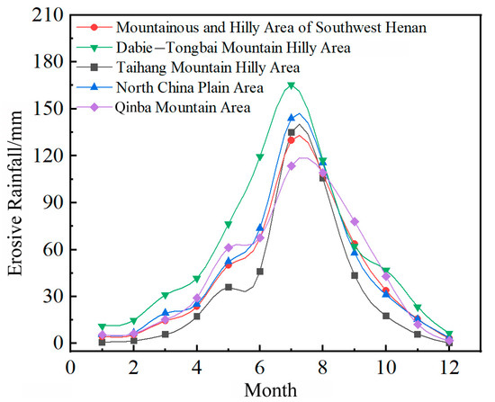 Rainfall erosivity is significantly affected by rainfall and erosive rainfall. It is significantly affected by seasonal changes, which is unimodal. According to the analysis of rainfall erosivity in Henan, the rainfall erosivity generally demonstrated a rising pattern from northwest to southeast. However, due to the high concentration of rainfall in warm season in the Taihang Mountain Hilly Area, the rainfall erosivity in July can surpass that in the Mountainous and Hilly Area of Southwest Henan, the North China Plain Area, and Qinba Mountain Area.