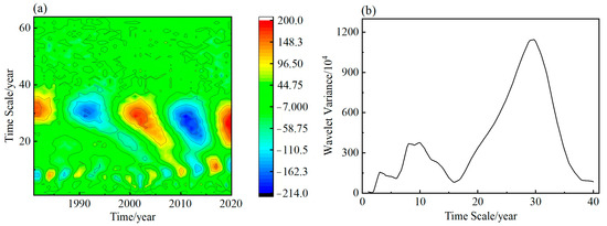 Wavelet analysis was applied to investigate the rainfall erosivity climate date in Henan for 40 years (Figure 4). The real component of Morlet wavelets can indicate the cyclic fluctuations of climate at various scales and the wavelet variance can divide the main period within the time series. In this study, the erosive rainfall in Henan from 1980 to 2020 is analyzed by wavelet analysis. The analysis showed that the erosive rainfall in Henan had a periodicity of 2–4 years, 9 years, 11 years, and 29–31 years, and the highest peak value was 30 years. Among them, 30 years stood out as the primary period of erosive rainfall change in Henan, and 3 years, 9 years, and 11 years were the second to fourth main periods. The periodic changes of erosive rainfall at all scales in Henan were relatively stable over the past 40 years.