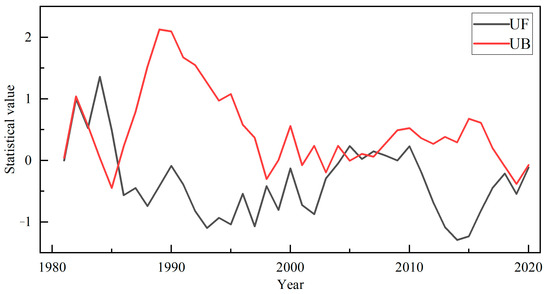 The Mann–Kendall test is a non-parametric method. It is relatively simple to calculate in geographic information analysis. It is calculated and analyzed by inverse sequence (UB) and constructing positive sequence (UF). The curves of UB and UF determine the variation trend and mutation characteristics [46]. The M-K mutation test can indicate mutation points in geography, and the expression of extreme climate trends is as follows:
