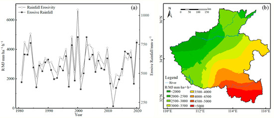 Changes of rainfall erosivity and erosive rainfall from 1981 to 2020 (a) and spatial distribution of rainfall erosivity in Henan from 1981 to 2020 (b).