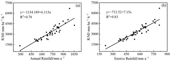 Linear fitting of rainfall erosivity to annual rainfall from 1981 to 2020 (a) and erosive rainfall from 1981 to 2020 (b).