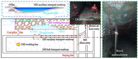 An 18 m coal pillar is present between the previous working face (1301) and the 1303 working face. However, the 1301 working face mining expands more to the crack, and part of the fissure is connected to the upper aquifer, so that there is a large amount of water in some areas of the 1301 goaf. Thus, the pillar must serve as a barrier against goaf water. The working face mining layout and the location of the goaf water can be seen in Figure 1.