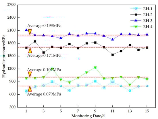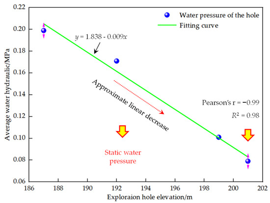 The average hydraulic pressure of each exploration hole can be observed in Figure 2, which shows that the the goaf water pressure in the detection area is relatively stable, and the fluctuation range is very small. It can be concluded that the goaf water in this area is static. According to the elevation of each water detection hole (in Figure 3), a linear relationship exists between average hydraulic pressure and exploration hole elevation. Combined with the calculation formula of static hydraulic pressure, P = ρg(H − h0), information can be obtained by analysis and calculation (H is the elevation of the horizontal plane, and h0 is the horizontal elevation of the exploration hole). The goaf water of the Nanhu Second Mine is static, and the water accumulation elevation is +209 m. The maximum static hydraulic pressure is 0.26 MPa.