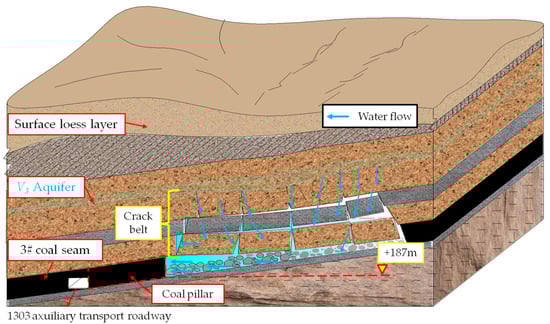 Therefore, according to the +183 m level of the lowest point of the roadway in the area affected by water, the water level is 26 m above the 3# coal seam, which is the location of the V3 aquifer. Combined with the lithologic characteristics of the 3# coal seam, it is known that the water resistance of the 3# coal seam direct roof, which is mainly formed of siltstone, is poor. Thus, the separation area formed after excavating the 1301 working face easily becomes the water accumulation space. With the connection of the fracture zone and the V3 aquifer, goaf water is finally produced. Moreover, the bottom plate of the 3# coal seam is mudstone, which has fewer pores. When the mudstone swells, it will greatly hinder the goaf water from penetrating further. Finally, a water accumulation area similar to a reservoir forms (in Figure 4).
